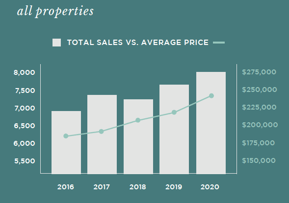 - From 2019 to 2020 the average sales price increased by 8.6%. In 2020 the average sales price was $240,407 compared to $221,455 in 2019.