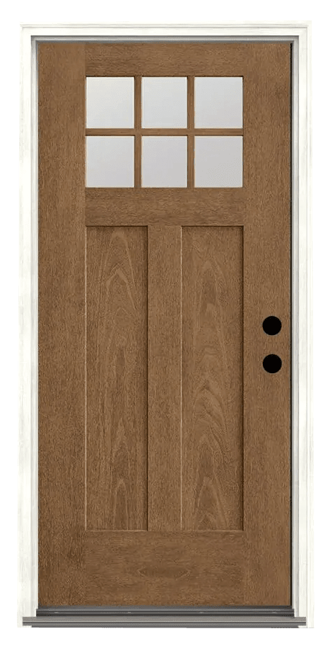 Similar to the door shown, this beautiful wood front door could be stained or painted a delicate blue. 6 Lite Clear Acorn Stained Fiberglass Pre-hung Front Door, $1,314,