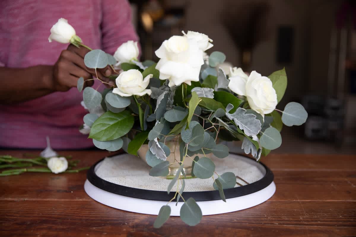 Use floral tape in a criss-cross pattern to keep the chicken wire in place. You’ll also need sharp floral snips for tending to the flowers. If you have a lazy Susan, you can rotate your arrangement to make sure it looks lovely from all angles. If not, try to arrange your flowers at a table or island where you can walk around to check in without moving the vase.
