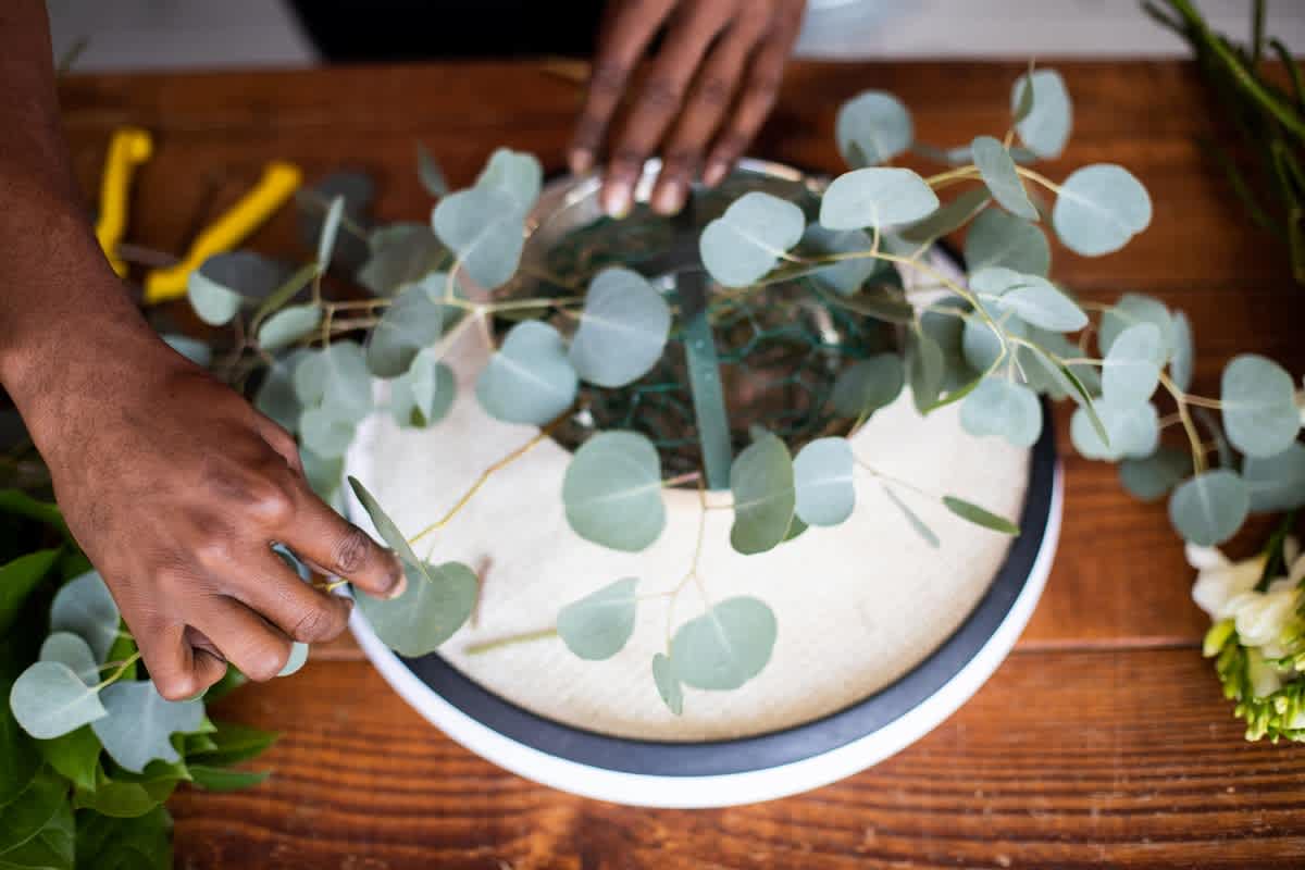 Snipping the ends as you go, place the greenery one variety at a time, beginning with the eucalyptus, allowing it to drape elegantly. Next, move onto the lemon leaf. Add enough to cover the “mechanics”—the floral wire, tape, and even the edge of the vessel. Finally, insert the dusty miller, spaced evenly throughout the arrangement. At this point, it should look like a lovely green pillow—soft and full.